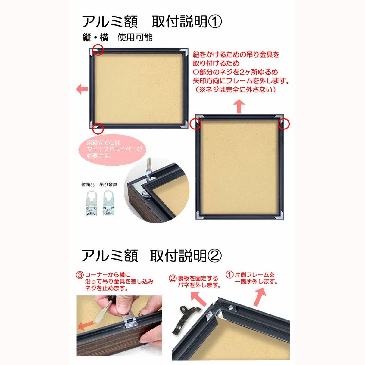付属品:フレーム、UVカットアクリル板(2mm厚)、白紙、裏板、紐(ひも)、外箱、吊り金具2ヶ、バネ(サイズにより個数は異なる)