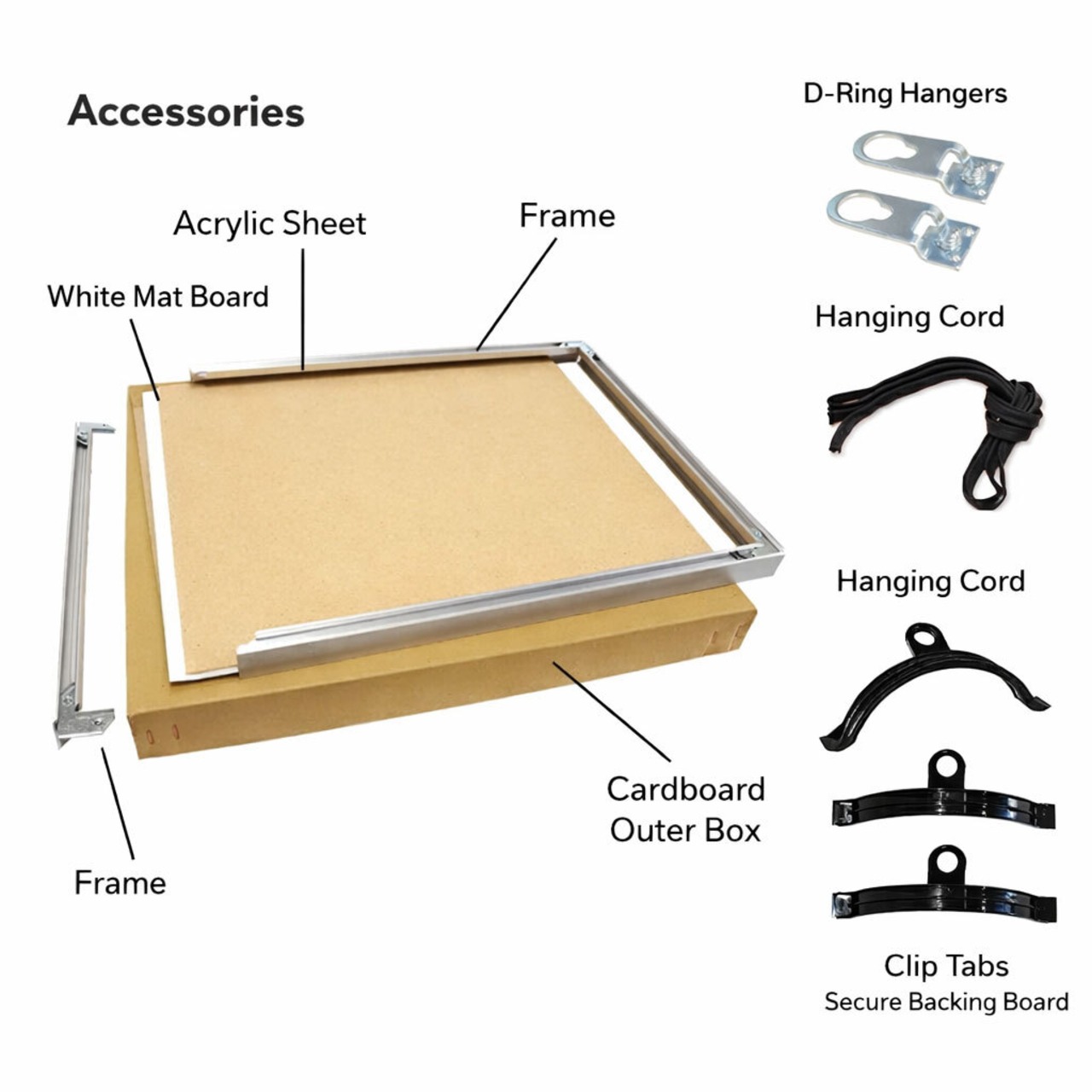 付属品:フレーム、UVカットアクリル板(2mm厚)、白紙、裏板、紐(ひも)、外箱、吊り金具2ヶ、バネ(サイズにより個数は異なる)