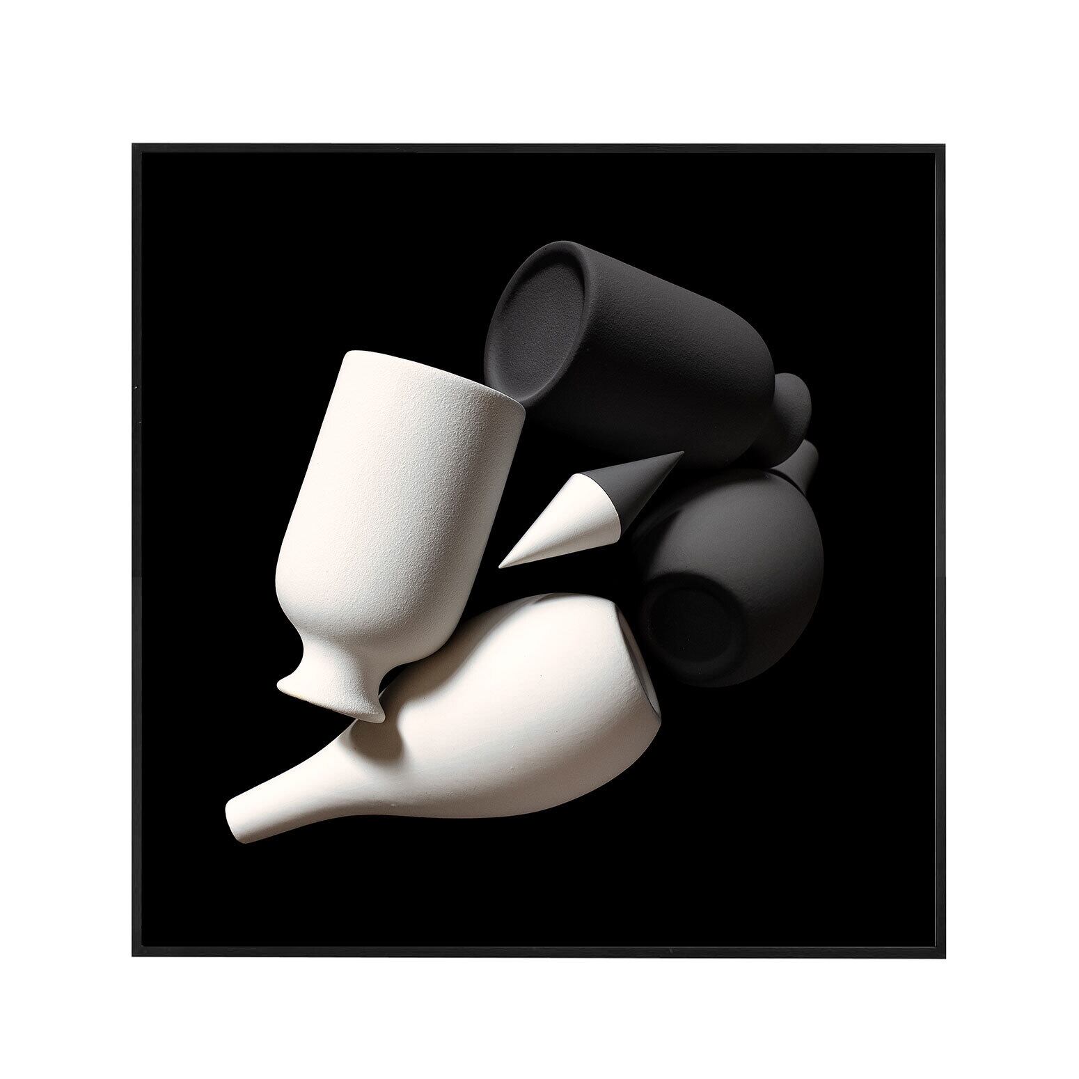 白い被写体をリフレクター上に配置して撮影した本作は、形や図像の反転によって多様な表情を生み出している。明確な存在感を持ちながらも、そこには「存在」と「不在」が同時に立ち現れる。前後や虚実といった視点の反転は、普段見過ごされがちな領域へと想像力を広げる。